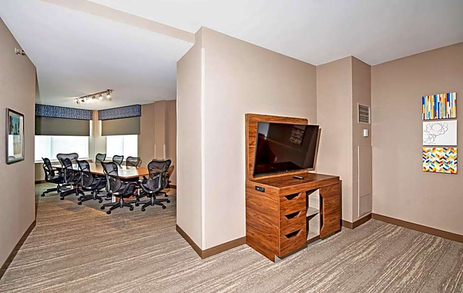 Features a 55-inch TVas well as a rain shower head and curved shower rod.